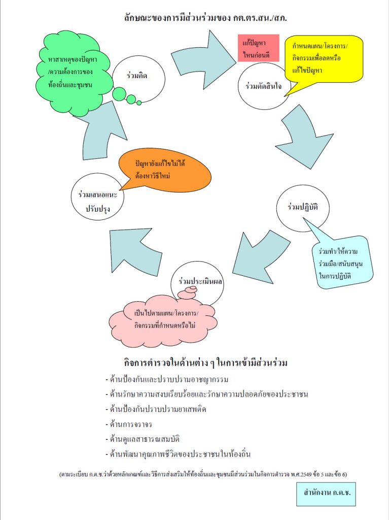 3. ภารกิจการมีส่วนร่วม เนื่องจากองค์กร กต.ตร.ในปัจจุบันเป็นองค์กรที่มีประชาชนในท้องถิ่น / ชุมชนเป็นกรรมการในสัดส่วนที่เท่า ๆ กันกับข้าราชการ ดังนั้นตามระเบียบ ก.ต.ช. ว่าด้วยหลักเกณฑ์และวิธีการส่งเสริมให้ท้องถิ่นและชุมชนมีส่วนร่วมในกิจการตำรวจ พ.ศ. 2549 จึงกำหนดให้ กต.ตร. เป็นองค์กรสำคัญมีบทบาทเป็นแกนนำในการให้ท้องถิ่น/ชุมชน เข้ามามีส่วนร่วมในการป้องกันปราบปรามอาชญากรรมและการรักษาความปลอดภัยในชีวิตและทรัพย์สินของประชาชน โดยกำหนดบทบาท ภารกิจของ กต.ตร.สน./สภ. กต.ตร.กทม. และ กต.ตร.จังหวัด ไว้ดังนี้