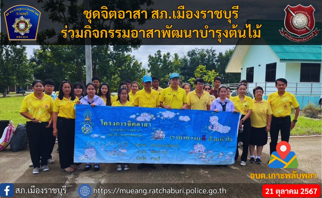 เมื่อวันที่ 21 ตุลาคม 2567 เวลา 09.00 น. ชุดจิตอาสา สภ.เมืองราชบุรี นำโดย พ.ต.ต.ธีะศักดิ์ สายเนตร สวป.(ชส.)สภ.เมืองราชบุรี วมกับส่วนราชการปกครองท้องถิ่น อบต.เกาะพลับพลา และประชาชนดำเนินกิจกรรมจิตอาสาพัฒนาบำรุงต้นไม้ โดยการใส่ปุ๋ย พรวนดิน กำจัดวัชพืช และตัดแต่งกิ่งไม้ เนื่องในวันรักต้นไม้ บริเวณ อบต.เกาะพลับพลา อำเภอเมือง จังหวัดราชบุรี