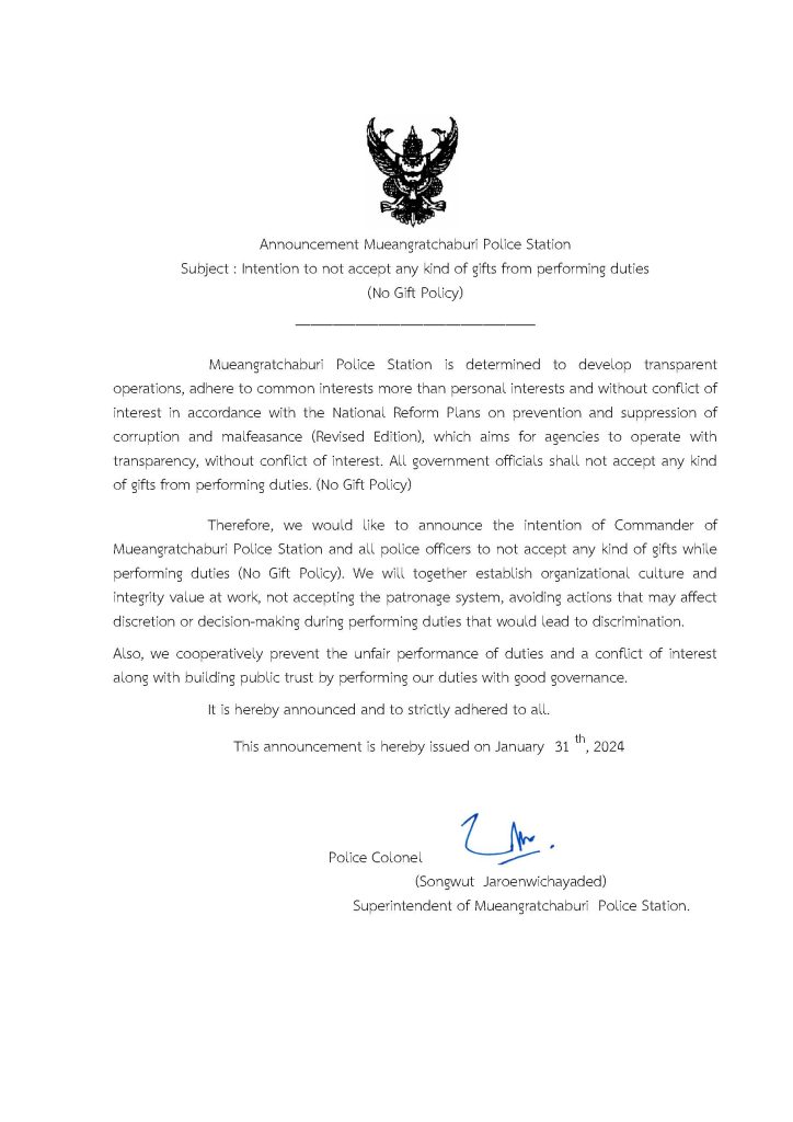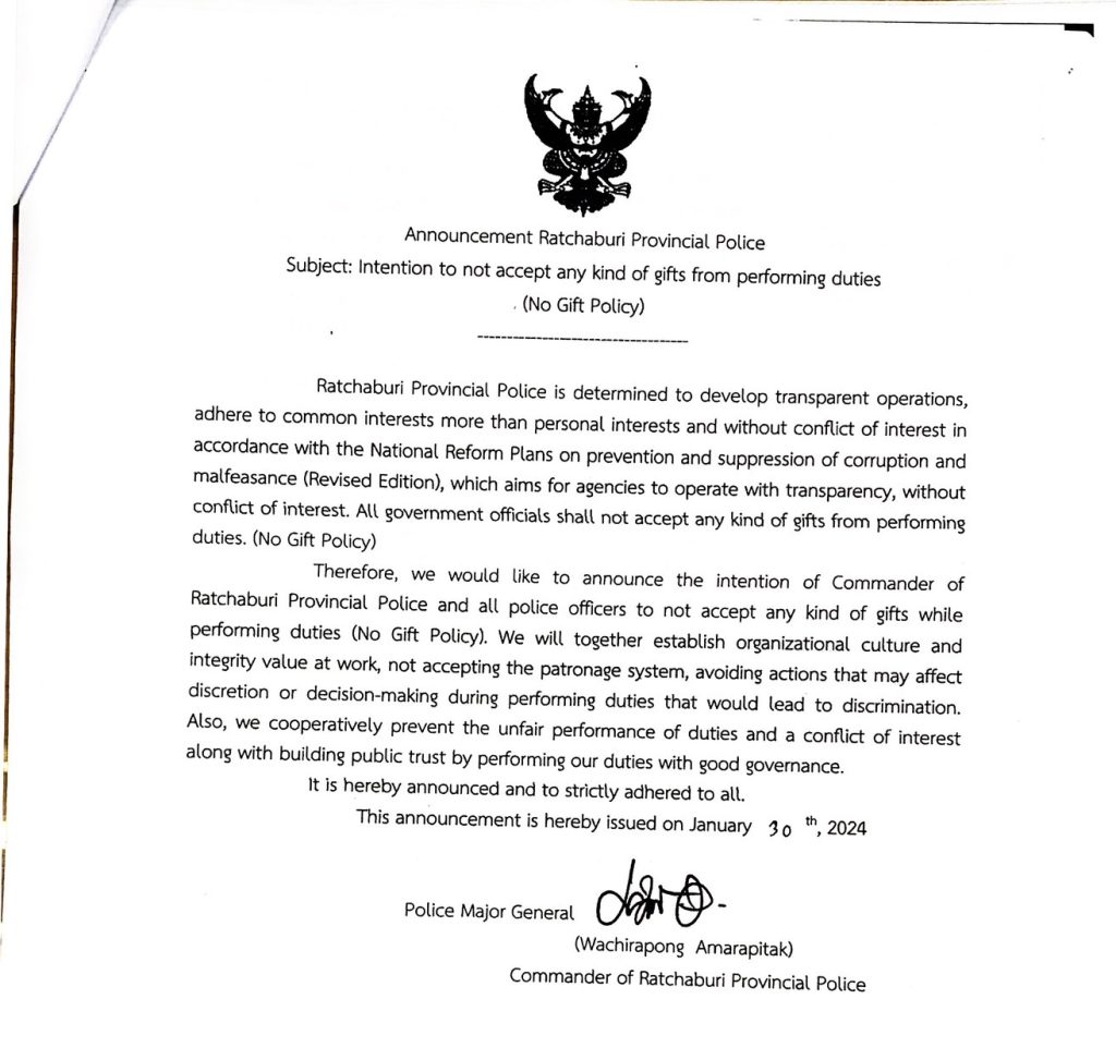 ประกาศเจตนารมณ์ที่จะไม่รับของขวัญและของกำนัลจากการปฏิบัติหน้าที่ (No Gift Policy) 31 มกราคม 2567 โดย adm_ratchaburi adm_ratchaburi / ข่าวประกาศและคำสั่ง ประกาศเจตนารมณ์ที่จะไม่รับของขวัญและของกำนัลทุกชนิดจากการปฏิบัติหน้าที่ (No Gift Policy) สถานีตำรวจภูธรเมืองราชบุรี ประกาศเจตนารมณ์ที่จะไม่รับของขวัญและของกำนัลทุกชนิดจากการปฏิบัติหน้าที่ (No Gift Policy) ตำรวจภูธรจังหวัดราชบุรี ประกาศเจตนารมณ์ที่จะไม่รับของขวัญและของกำนัลทุกชนิดจากการปฏิบัติหน้าที่ (No Gift Policy) ตำรวจภูธรภาค 7 Post Views: 108