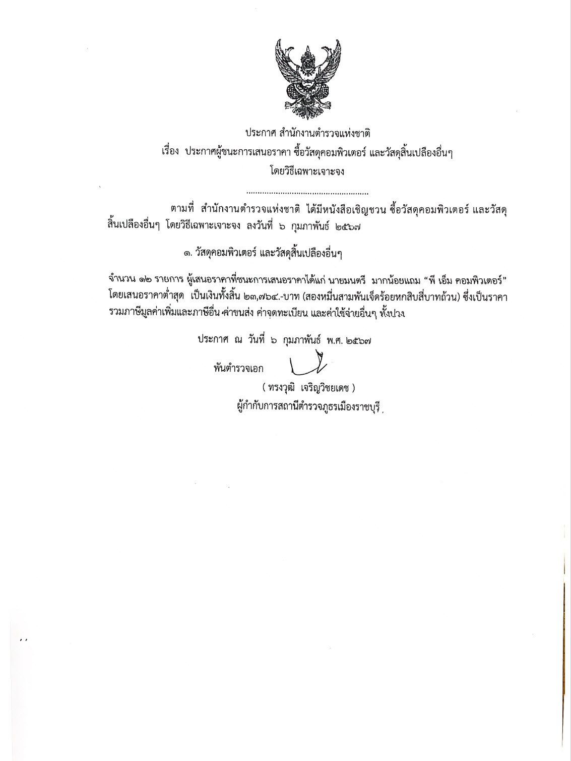 ประกาศผู้ชนะเสนอราคา ซื้อวัสดุคอมพิวเตอร์ และวัสดุสิ้นเปลืองอื่นๆ โดยวิธีเฉพาะเจาะจง (6 ก.พ.67)
