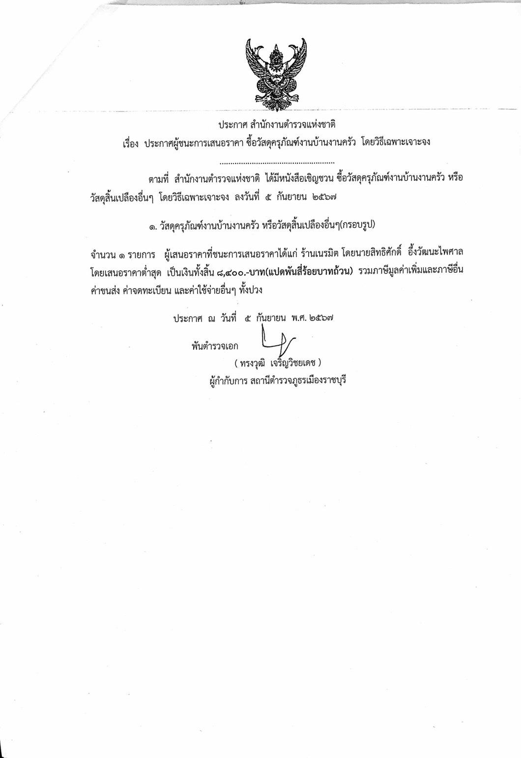 ประกาศผู้ชนะการเสนอราคา ซื้อวัสดุครุภัณฑ์งานบ้านงานครัว โดยวิธีเฉพาะเจาะจง (5 ก.ย.67)